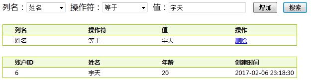 可能大多数程序猿想法,这是新的需求,那么就直接改代码,简单粗暴。然后在前台加个age范围文本框,后台再加个if判断,realname的=号就直接改成like,就这样轻松搞定了。但需求总是不断变化,如果一张表有50个字段,同时需要支持其中40个字段查询。我想大都数人第一反应:卧槽,神经病!难道就没有一个通用的办法来解决这种搜索的问题?我想说当然有,本文接下来就用DapperExtensions和反射的来解决这个问题,最终于实现的效果如下图: