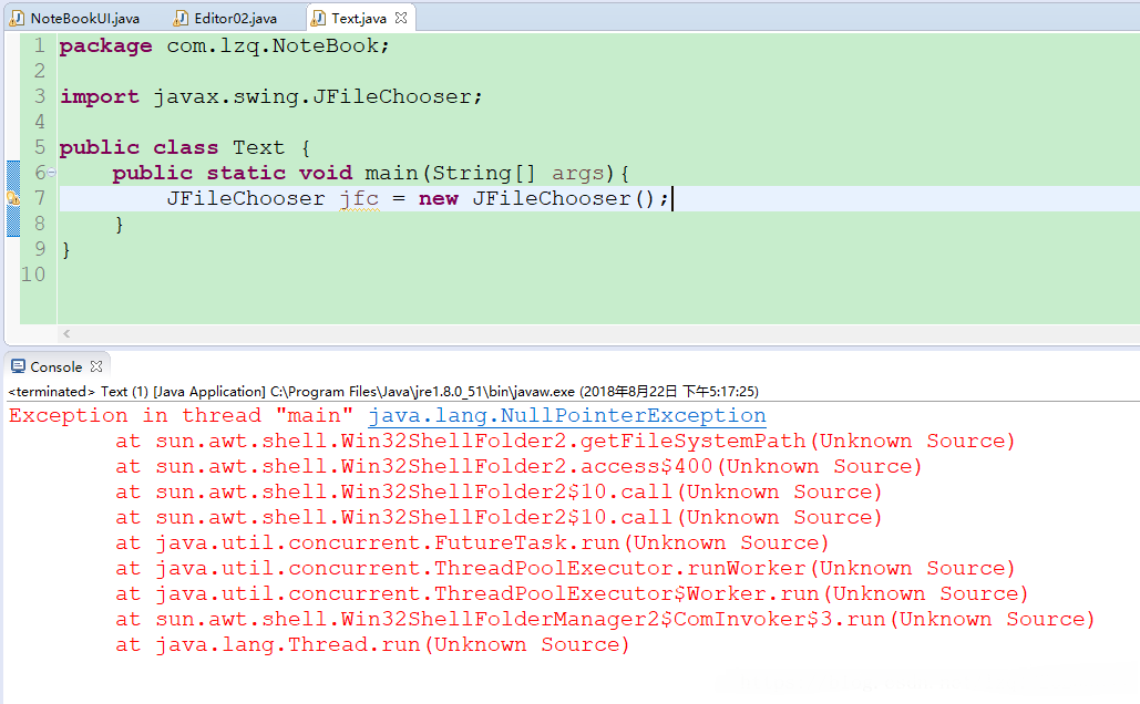 极少部分人运气不好可能遇到这样一个问题。只要实例化JFileChooser对象就会报空指针异常;