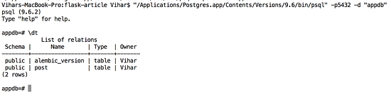 $ python app.py db migrate INFO [alembic.runtime.migration] Context impl PostgresqlImpl. INFO [alembic.runtime.migration] Will assume transactional DDL. INFO [alembic.autogenerate.compare] Detected added table 'post' Generating /Users/Vihar/Desktop/flask-databases/migrations/versions/ed3b3a028447_.py ... done