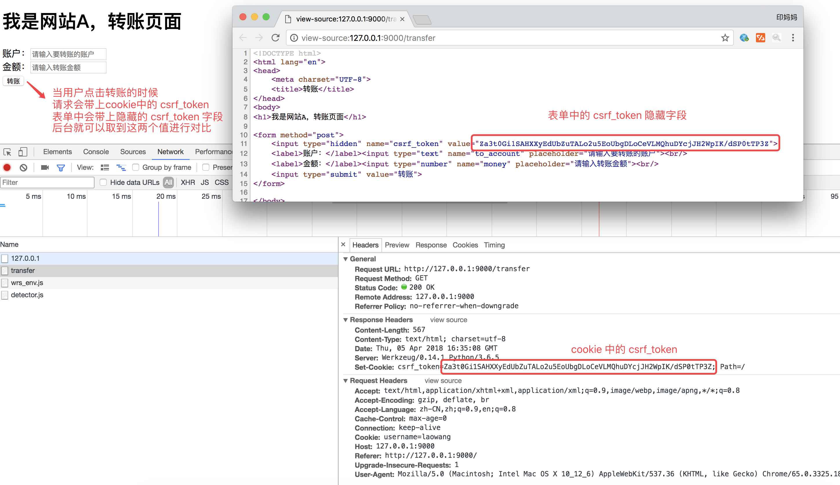 运行测试,用户直接在网站 A 操作没有问题,再去网站B进行操作,发现转账不成功,因为网站 B 获取不到表单中的 csrf_token 的隐藏字段,而且浏览器有同源策略,网站B是获取不到网站A的 cookie 的,所以就解决了跨站请求伪造的问题