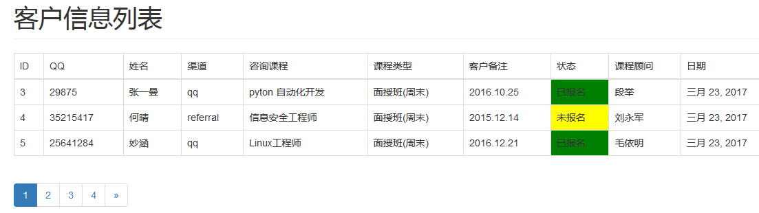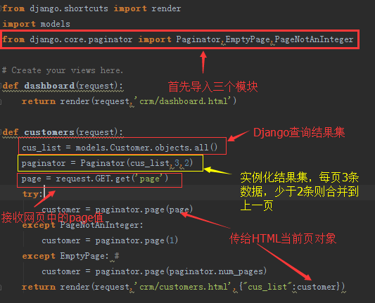 p = Paginator(objects,3) # 3条数据为一页,实例化分页对象 print p.count # 10 对象总共10个元素 print p.num_pages # 4 对象可分4页 print p.page_range # xrange(1, 5) 对象页的可迭代范围 page1 = p.page(1) # 取对象的第一分页对象 print page1.object_list # 第一分页对象的元素列表['john', 'paul', 'george'] print page1.number # 第一分页对象的当前页值 1 page2 = p.page(2) # 取对象的第二分页对象 print page2.object_list # 第二分页对象的元素列表 ['ringo', 'lucy', 'meiry'] print page2.number # 第二分页对象的当前页码值 2 print page1.has_previous() # 第一分页对象是否有前一页 False print page1.has_other_pages() # 第一分页对象是否有其它页 True print page2.has_previous() # 第二分页对象是否有前一页 True print page2.has_next() # 第二分页对象是否有下一页 True print page2.next_page_number() # 第二分页对象下一页码的值 3 print page2.previous_page_number() # 第二分页对象的上一页码值 1 print page2.start_index() # 第二分页对象的元素开始索引 4 print page2.end_index() # 第2分页对象的元素结束索引 6