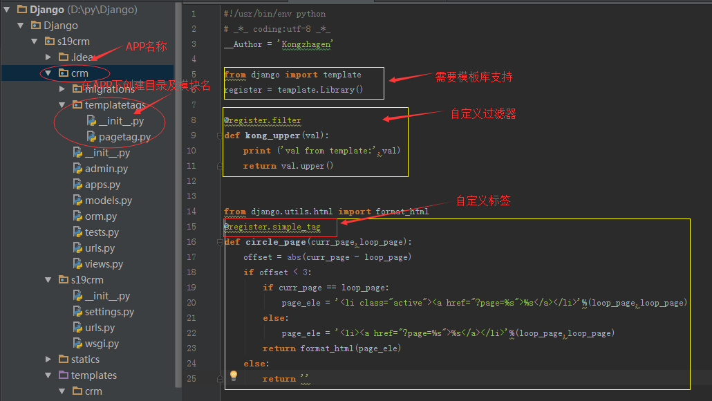 在你的app下创建templatetags包,在其下创建python脚本来定义你的标签和过滤器,如: