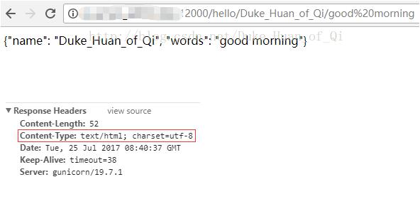 PS: 直接返回json.dumps的结果是可行的,因为flask会判断并使用make_response方法自动构造出响应,只不过响应头各个字段是默认的。若要自定义响应字段,则可以使用make_response或Response自行构造响应。用chrome访问的响应页面如下图。
