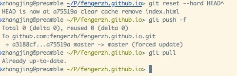 还是这个git reset --hard命令,只不过这次多了一个参数origin/master,正如我们上面讲过的,origin/master代表远程仓库,既然你已经污染了你的本地仓库,那么就从远程仓库把代码取回来吧。