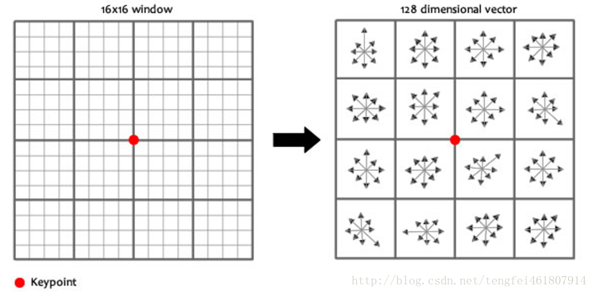 基本原理是选取关键点周围16×16的像素区域,分成4个小块,每个小块创建8个bin的直方图,这总共的128个信息的向量就是关键点描述符的主要内容。此外还要测量,以达到光照、旋转的稳定性。如图