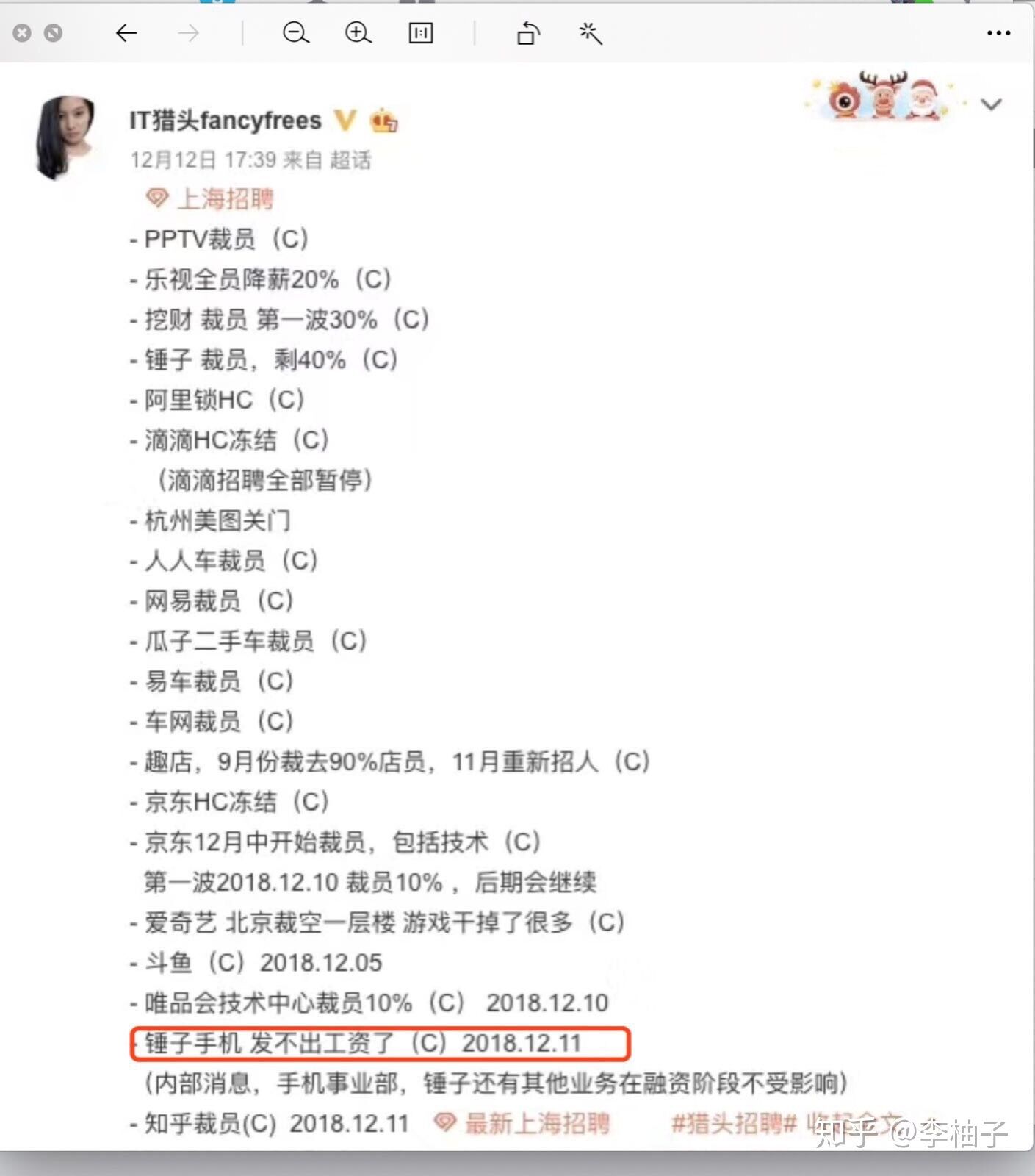 2018年,宏观经济的不景气终于传导到了个人身上,"裁员"消息一波接着一波。烧钱最猛的各互联网大厂员工,率先沦为泡沫破灭时的"代价",年底被裁,哀鸿遍野。据统计,从京东、知乎、锤子、到近期的美团、摩拜等,过去几个月,至少11家大型互联网企业传出裁员消息。时至今日,没有一家公司承认自己"裁员",但"裁员"动作最后均落地实施。进入12月份,社交网站上"裁员"爆料突起,百度搜索指数冲至半年内最高。